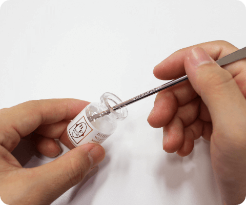 バイアル瓶の中で仮死状態の美肌菌は、水分を与えることで再び活動を始めます。